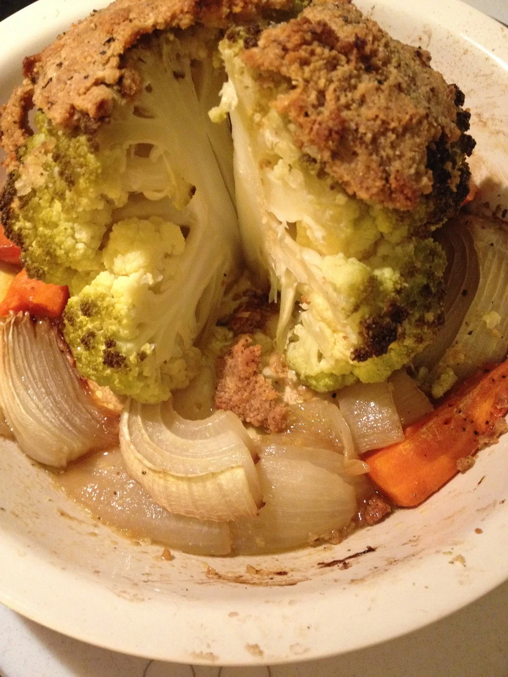 Spread the crust mixture all over the top of the cauliflower and place in a 350 degree oven for about 1 1/2 hour.s or until a fork or knife can easily slide into the center of the cauliflower. Now here is the hard part. The crust is sooooo good that you will want to break it off and eat it right then and there. But, try to hold off and serve. Cut into the cauliflower like you would a pie and serve.