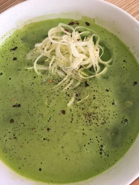 Since bone broth is the rave for many, and since it has become a staple in my house, I keep finding different ways to incorporate veggies with it. Of course, soups are perfect, but sometimes we want an easier version. Here you see this beautiful green broth (this is chicken but you could use veggie or beef stock). I added a hand full of cilantro and blended is in my Vita Mix. I can't even tell you how delicious it was. Top it with your veggies of choice.