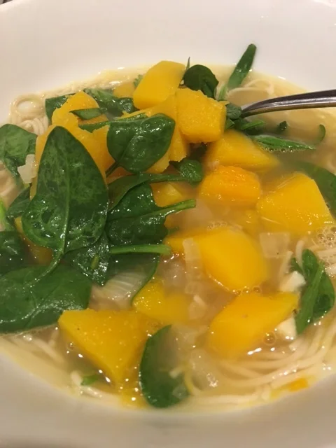 So, easy and cooks within about 5 minutes. I make this type of soup all the time, something with the noodles and sometimes without. It is so quick and easy, with the exception of cutting the squash. Some stores (like Trader Joes) carry the squash all cleaned and ready to go.