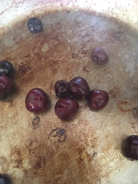 Hot Berries: This is the cool part. After the cakes are all cooked, toss a cup of blueberries, cherries or other fruits or berries into the pan. If they are fresh, then will just need a quick swirl in the pan to warm them. Yet, if they are frozen they will make a huge sizzle sound and steam up a quickly. Doing this also makes the pan look like the picture below. But, don't worry, it actually cleans up easily. It is just the color from the berries that instantly coats the pan. Toss the berries, or cherries in this case, around a bit until they thaw - about 3 minutes. You can most likely turn the heat off the moment you toss them in. While they are warming (thawing), butter your cakes (or not), pour a small amount of Maple syrup on them (or not). Top with the warmed fruit. (put the pan in water immediately and let it soak-it will then be easy to clean).